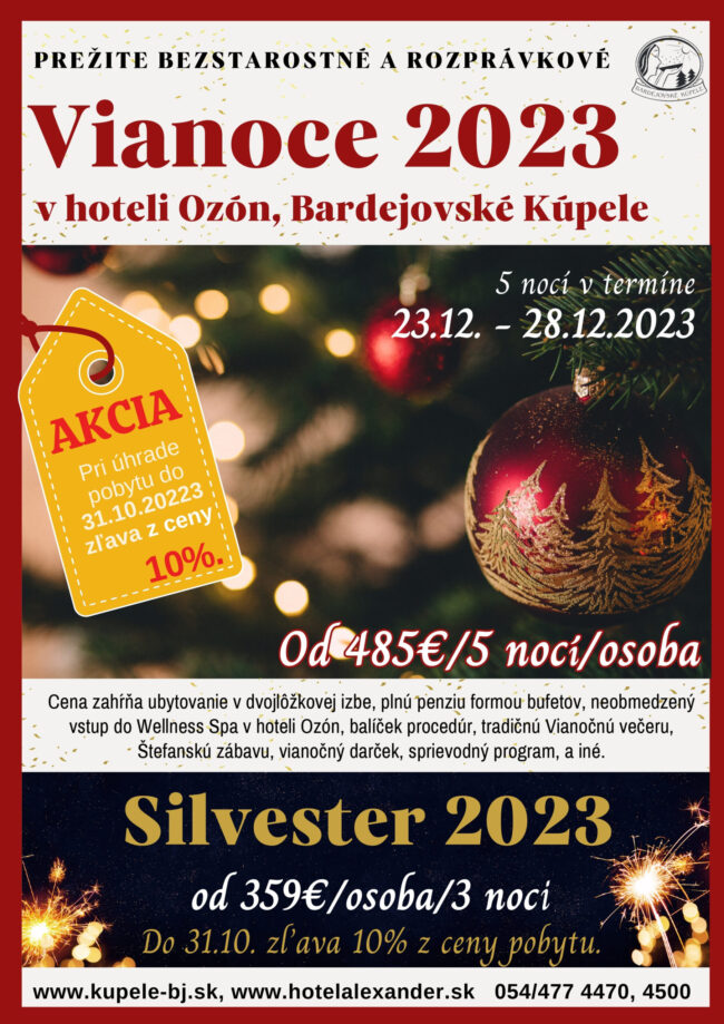 Do Vianoc a Silvestra ostávajú necelé tri mesiace a tak je ten pravý čas rezervovať si Vianočný a Silvestrovský pobyt v Bardejovských Kúpeľoch, nielen preto, aby sa vám ušiel, ale aby ste mali pobyt za tú najlepšiu cenu. Pri zaplatení do 31.októbra 2024 majú klienti zľavu 10% a do 30. novembra zľavu 5% z uvedených cien. Vianoce v hoteli Ozón…